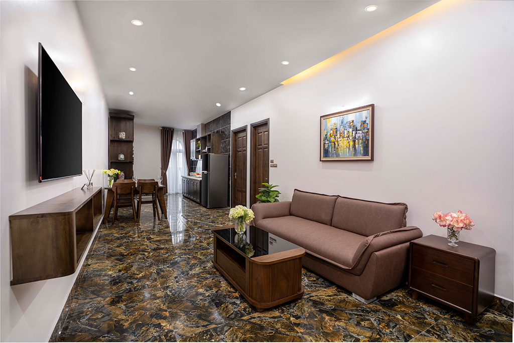 Căn hộ 2 phòng ngủ hướng thành phố, là lựa chọn hoàn hảo cho gia đình hoặc nhóm bạn cần không gian riêng tư và thoải mái. Thiết kế hiện đại, sang trọng với phòng khách lớn, khu bếp tiện nghi, bàn ăn, sofa thư giãn và bàn trà. Phòng tắm rộng rãi, trang bị đầy đủ thiết bị cao cấp, mang đến trải nghiệm nghỉ dưỡng đẳng cấp giữa lòng thành phố.